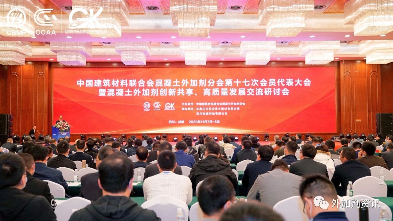 2020年11月7日上午,中國建材聯合會混凝土外加劑分會第十七次會員代表大會在美麗蓉城——成都盛大開幕,會場內座無虛席,氣氛隆重而熱烈。